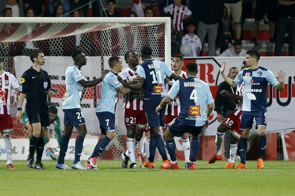 - © 2018 AFP | Crée le 23.05.2018 à 13h56 | Mis à jour le 23.05.2018 à 14h00ImprimerEchauffourrées dans la surface de réparation d'Ajaccio lors du barrage de Ligue 2 contre Le Havre, le 20 mai 2018 en Corse PASCAL POCHARD-CASABIANCA-AFP