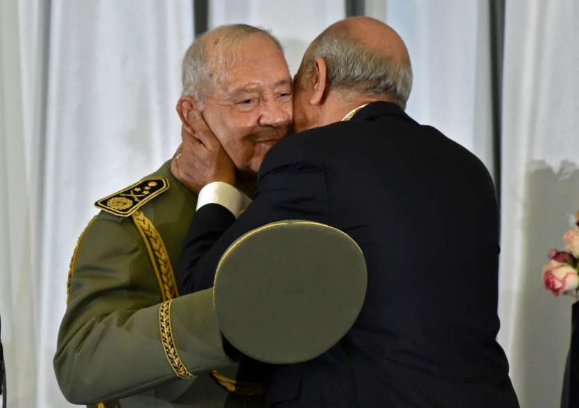 - © 2019 AFP | Crée le 23.12.2019 à 23h25 | Mis à jour le 23.12.2019 à 23h30ImprimerLe général Ahmed Gaïd Salah (de face), chef d'état-major de l'armée, reçoit l'accolade du nouveau président algérien Abdelmadjid Tebboune, le 19 décembre 2019 à Alger lors de l'intronisation du nouveau chef de l'Etat RYAD KRAMDI -AFP/Archives