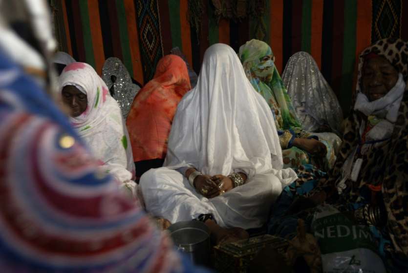 Dans la tente des femmes où s'élève une odeur d'encens, une maquilleuse se saisit d'un pot contenant une poudre parfumée et diluée dans l'eau, pour peindre des motifs sur le visage de la mariée. D'autres lui passent dans les doigts des bagues offertes par l'époux et lui tatouent les mains de henné, comme le veut la tradition.