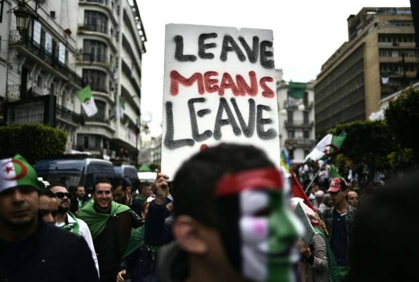 - © 2019 AFP | Crée le 09.04.2019 à 19h13 | Mis à jour le 09.04.2019 à 19h15ImprimerManifestation d'Algériens contre le régime le 5 avril 2019 à Alger RYAD KRAMDI -AFP