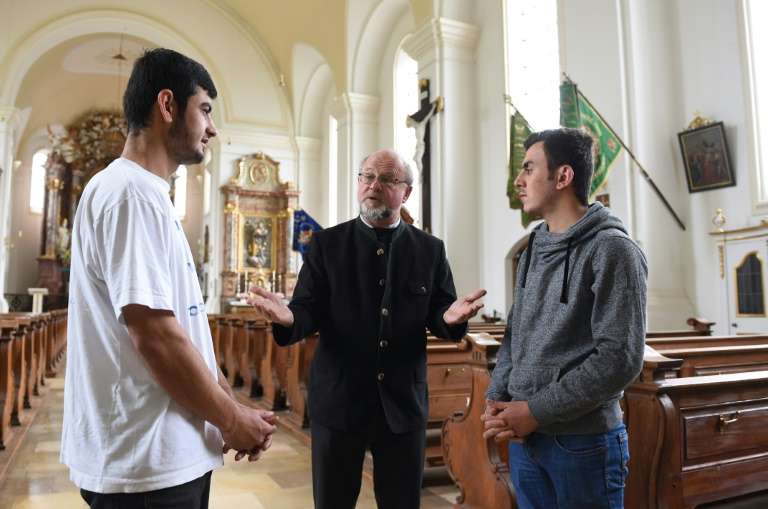 - © 2016 AFP | Crée le 26.05.2016 à 17h51 | Mis à jour le 26.05.2016 à 17h55ImprimerLe pasteur Peter Brummer s'entretient avec des migrants Peshtiwan Nasser Abdal (g) et Suud-iazdxn Arab (d), dans l'église Saint Joseph de Tutzing (sud de l'Allemagne), le 24 mai 2016