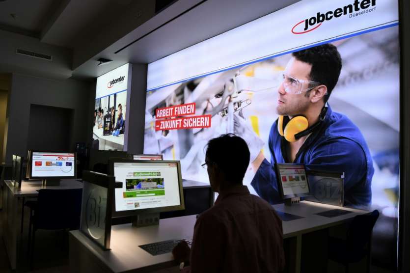 - © 2017 AFP | Crée le 29.09.2017 à 20h49 | Mis à jour le 29.09.2017 à 20h50ImprimerUne agence pour l'emploi à Düsseldorf, dans l'ouest de l'Allemagne, le 25 août 2017 PATRIK STOLLARZ-AFP/Archives