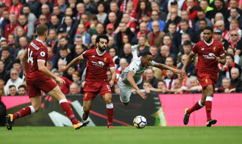 - © 2017 AFP | Crée le 15.10.2017 à 00h46 | Mis à jour le 15.10.2017 à 00h50ImprimerDuel entre les attaquants de Liverpool Mohamed Salah (g) et de Manchester United Anthony Martial, le 14 octobre 2017 à Anfield Paul ELLIS-AFP