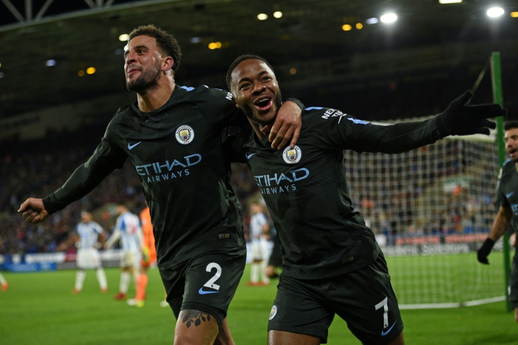 - © 2017 AFP | Crée le 28.11.2017 à 23h36 | Mis à jour le 28.11.2017 à 23h40ImprimerLe milieu de terrain de Manchester City Raheem Sterling (d) vient de marquer contre Huddersfield, en Premier League, et manifeste sa joie aux côtés de son coéquipier défenseur Kyle Walker, le 26 novembre 2017 à Huddersfield Oli SCARFF -AFP/Archives