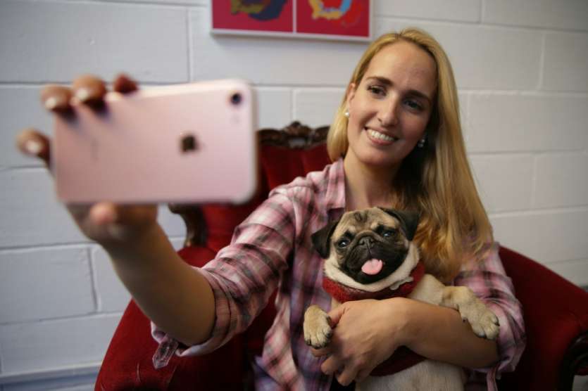 - © 2017 AFP | Crée le 28.10.2017 à 22h58 | Mis à jour le 28.10.2017 à 23h00ImprimerAida Martinez prend un selfie avec Mia, star du Pugs & Pals cafe, bar dédié aux amoureux du carlin ("pug", en anglais), à Brick Lane, dans l'est de Londres, le 27 octobre 2017 Daniel LEAL-OLIVAS-AFP