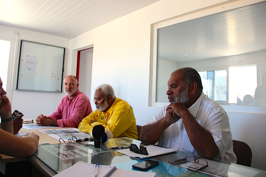 - | Crée le 20.11.2019 à 11h38 | Mis à jour le 20.11.2019 à 11h41ImprimerLouis Kotra Uregei, Roger Noraro et l'avocat Me Xavier Lombardo ont tenu une conférence de presse, ce mercredi matin, dans les locaux de la société SAT (société d'acconage et de transport). Photo J.-A.G.-L.