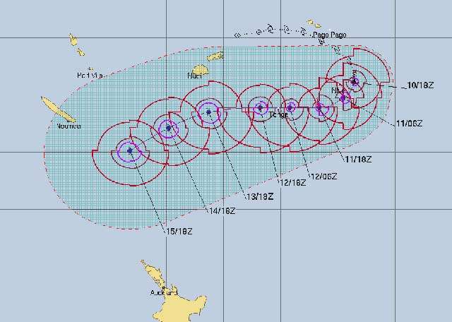 Source : Facebook Disaster Management Office - SamoaLe phénomène, passé en catégorie 3 au cours de la nuit, se déplace en direction du sud à la vitesse de 22 km/h et devrait progressivement s'orienter vers le sud-ouest ce dimanche, selon le Fiji Meteorological Services (FMS). Il génère des vents estimés à 150 km/h, rafales à 200 km/h, près de son centre. « Et la possibilité est très élevée que le phénomène s'intensifie. Nous nous attendons donc à un passage en cyclone de catégorie 4 », a indiqué un prévisionniste du FMS.