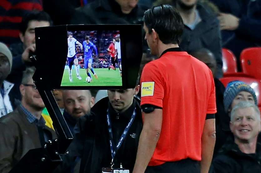 - © 2018 AFP | Crée le 19.04.2018 à 04h29 | Mis à jour le 19.04.2018 à 04h35ImprimerL'arbitre utilise l'assistance vidéo à l'arbitrage (VAR) lors du match amical Angleterre-Italie à Wembley, le 27 mars 2018 Ian KINGTON-AFP/Archives