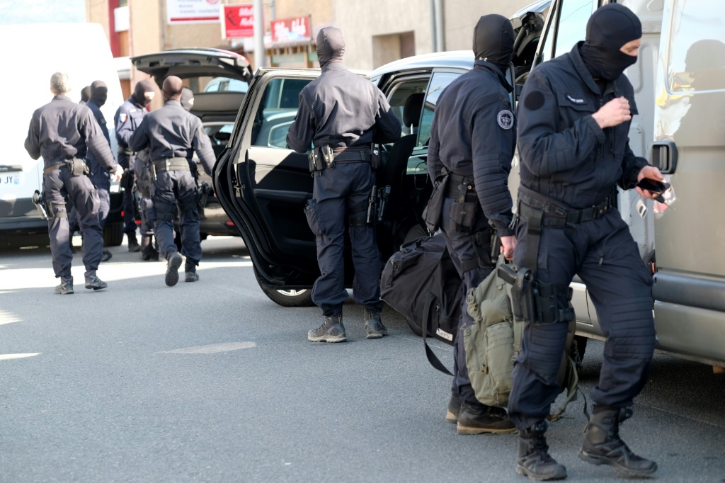 - © 2018 AFP | Crée le 24.03.2018 à 16h49 | Mis à jour le 24.03.2018 à 16h55ImprimerDes membres du GIGN devant le supermarché Super U de Trèbes après une prise d'otages le 23 mars 2018 ERIC CABANIS-AFP