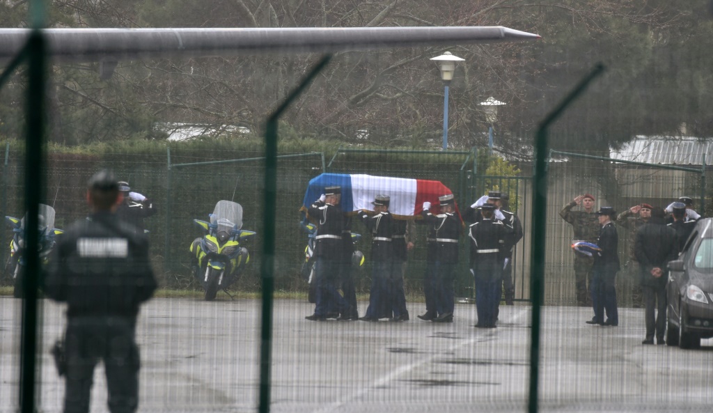 Sous une pluie battante, la dépouille avait été escortée par des gendarmes à l'intérieur d'un hangar sur le tarmac de l'aéroport de Carcassonne, où a eu lieu une cérémonie en présence des proches de la victime, des représentants des gendarmes, de l'armée de terre, de la Légion étrangère.