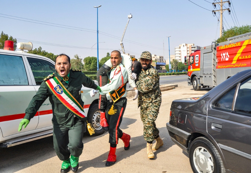 - © 2018 AFP | Crée le 24.09.2018 à 00h44 | Mis à jour le 24.09.2018 à 00h45ImprimerUn homme porte un soldat blessé lors d'une attaque à Ahvaz, dans le sud-ouest de l'Iran, le 22 septembre 2018 BEHRAD GHASEMI-ISNA/AFP