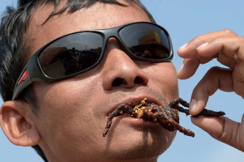 On trouve au Cambodge comme en Thaïlande, des araignées grillées, des criquets et des scorpions, les insectes étant un aliment traditionnel dans le Sud-est asiatique.