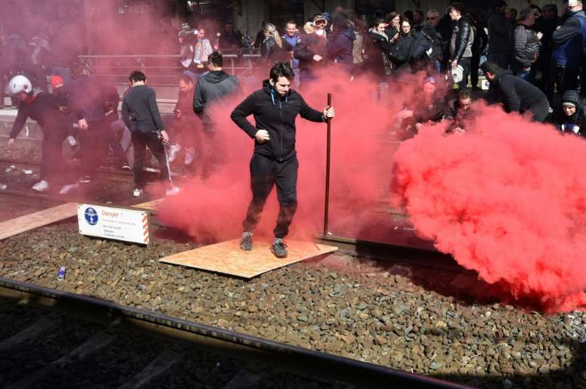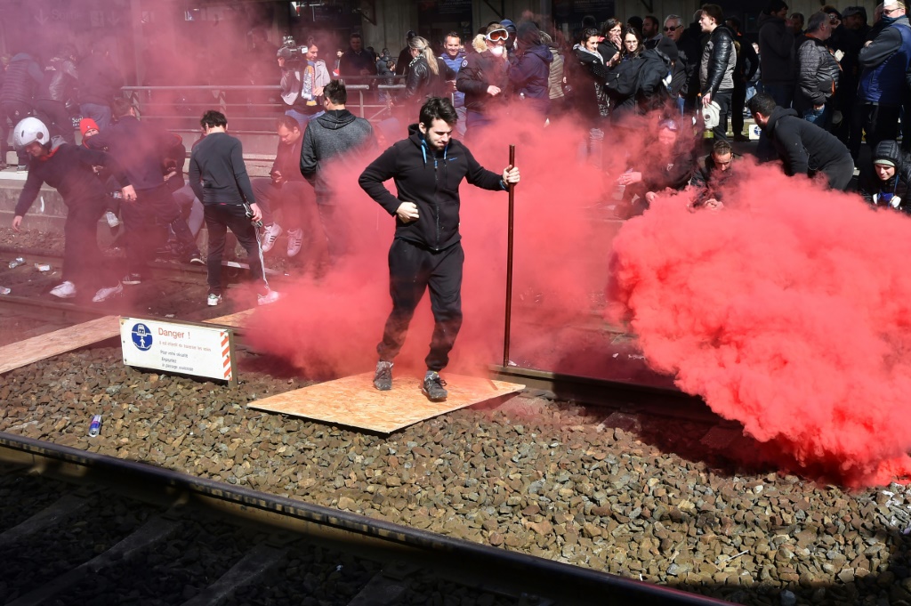 - © 2019 AFP | Crée le 26.03.2019 à 01h25 | Mis à jour le 26.03.2019 à 01h30ImprimerDes forains bloquent les voies à la gare du Mans, le 25 mars 2019 JEAN-FRANCOIS MONIER -AFP
