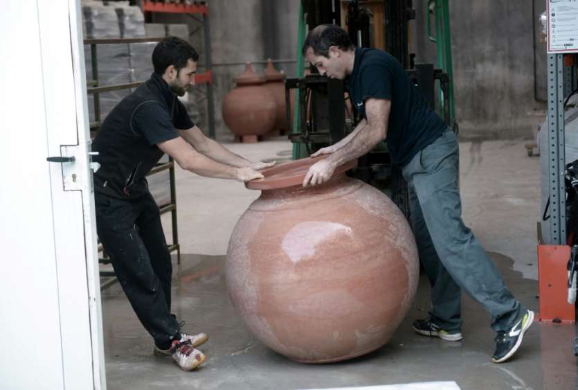 - © 2017 AFP | Crée le 04.11.2017 à 20h18 | Mis à jour le 04.11.2017 à 20h20ImprimerInaki Goicoechea (g) et un artisan potier manipulent une jarre en terre cuite dans lequel ils font du vin à la manière des viticulteurs géorgiens, dans son atelier à Ossès ( sud-ouest de la France), le 12 octobre 2017 IROZ GAIZKA-AFP