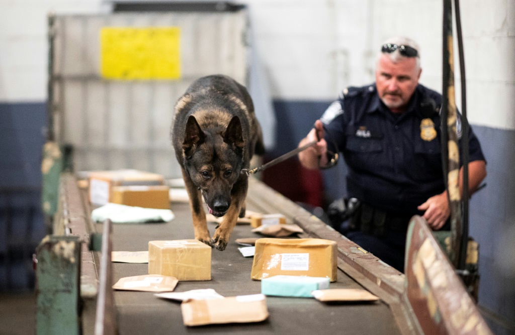 - © 2019 AFP | Crée le 18.10.2019 à 17h12 | Mis à jour le 18.10.2019 à 17h15ImprimerUn agent de la douane américaine, aidé par un berger allemand, cherche de la drogue dans des paquets arrivés au centre de tri postal de l'aéroport John F. Kennedy, le 24 juin 2019 à New York Johannes EISELE-AFP