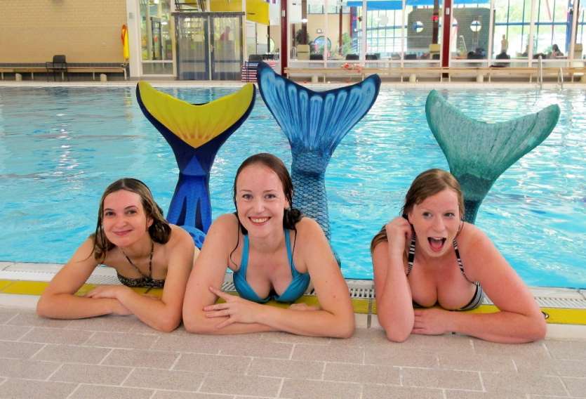Les jambes confinées dans un tissu aux motifs aquatiques, les apprenties découvrent pour la première fois la vie de femme-poisson, faisant frétiller joyeusement leur nouvel appendice vert et bleu dans le bassin d'un centre aquatique de Zeist, dans le centre du pays.