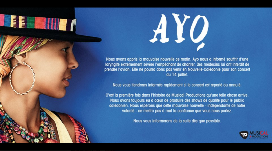 C'est Musical Production qui a annoncé la mauvaise nouvelle sur sa page Facebook : « Ayo nous a informés souffrir d'une laryngite extrêmement sévère l'empêchant de chanter. Ses médecins lui ont interdit de prendre l'avion. Elle ne pourra donc pas venir en Nouvelle-Calédonie pour son concert du 14 juillet », écrit l'organisateur de l'événement, actuellement en contact avec l'équipe de la chanteuse pour savoir si sa prestation peut être reportée, ou devra être purement et simplement annulé. Dans ce cas, les conditions de remboursement devraient être précisées dans les jours à venir.