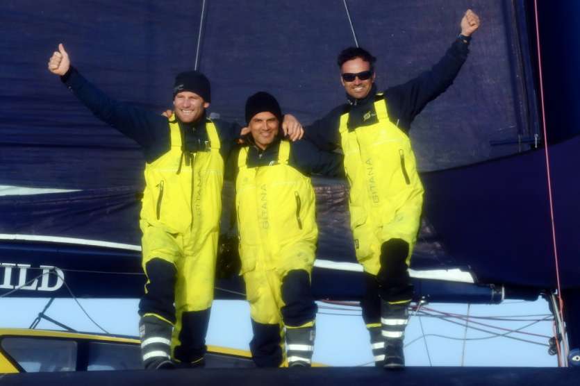 - © 2019 AFP | Crée le 04.12.2019 à 23h43 | Mis à jour le 11.12.2019 à 08h09ImprimerFranck Cammas (g) et Charles Caudrelier (d) avec leur "Media Man" Yann Riou à bord de leur Maxi Edmond de Rothschild à l'arrivée de la Brest Altantiques, le 4 décembre 2019 à Brest Fred TANNEAU-AFP