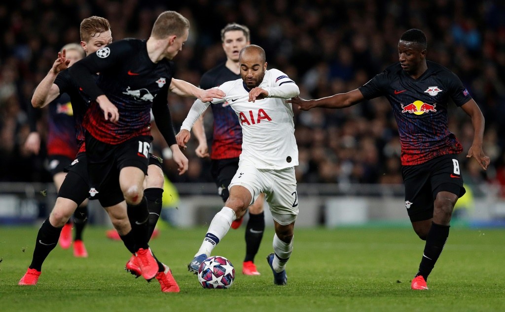 - © 2020 AFP | Crée le 20.02.2020 à 09h17 | Mis à jour le 20.02.2020 à 09h20ImprimerL'attaquant Brésilien de Tottenham Lucas Moura (c) pris en étau par les joueurs de Leipzig Marcel Halstenberg (g), Lukas Klostermann et Amadou Haidara (d) en 8es de finale de Ligue des champions, le 19 février 2020 à Londres Adrian DENNIS-AFP