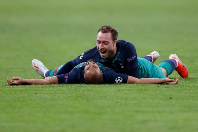 - © 2019 AFP | Crée le 09.05.2019 à 08h43 | Mis à jour le 09.05.2019 à 08h45ImprimerLa joie du Brésilien Lucas Moura (dos au sol), auteur d'un triplé contre l'Ajax, et de son coéquipier Christian Eriksen après la qualification pour la finale de la Ligue des champions, le 8 mai 2019 à Amsterdam Adrian DENNIS-AFP