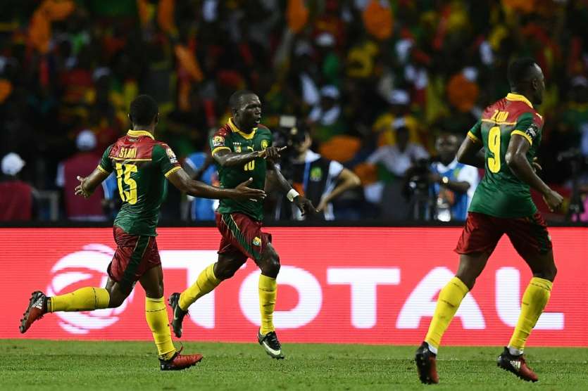 - © 2017 AFP | Crée le 06.02.2017 à 08h08 | Mis à jour le 06.02.2017 à 08h10ImprimerVincent Aboubakar (c) fête son but pour le Cameroun contre l'Egypte en finale de la CAN, le 5 février 2017 à Libreville GABRIEL BOUYS -AFP