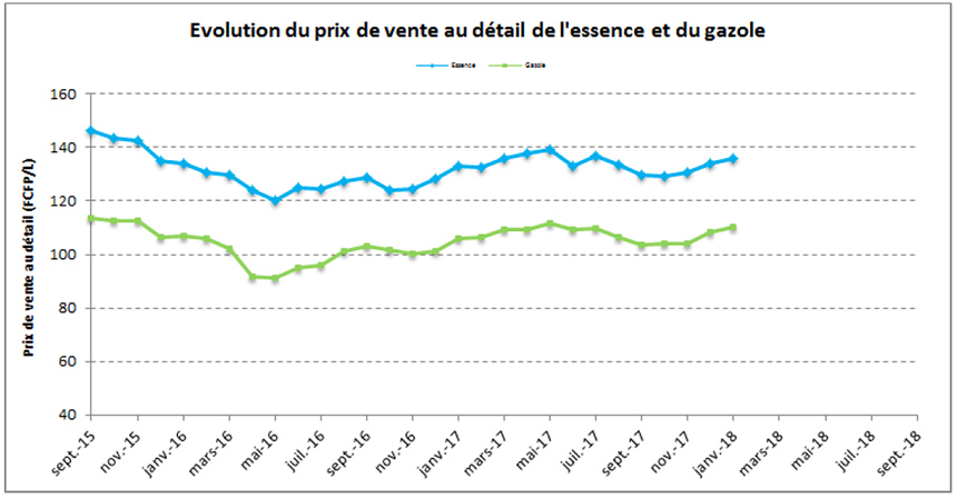 Le prix public du gazole passe quant à lui à 110,5 F/litre, au lieu de 108,5 F/litre en décembre, soit une hausse de 2 F/litre (+ 1,8 %).