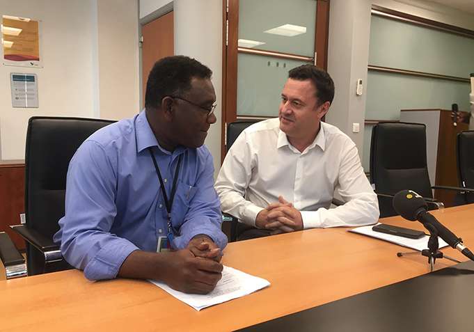 - | Crée le 28.07.2020 à 09h43 | Mis à jour le 28.07.2020 à 12h29ImprimerDaniel Roneice, manager Responsabilité Sociétale des Entreprises chez Vale NC, et le PDG Antonin Beurrier, au siège de la société, à Nouméa, ce mardi matin. Photo Y.M.