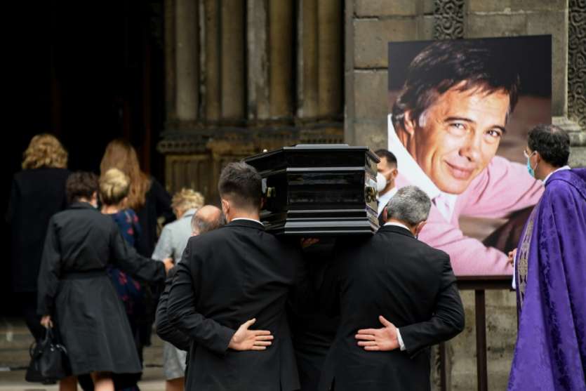 Une grande photo de l'artiste, vêtu d'un pull rose, était affichée sur un des piliers de l'église dont l'accès, réservé à des personnalités du monde du spectacle, était protégé par des barrières en raison de l'épidémie de coronavirus.