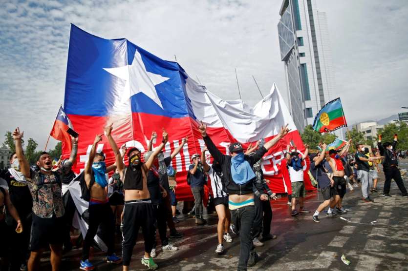 - © 2019 AFP | Crée le 24.10.2019 à 09h34 | Mis à jour le 24.10.2019 à 09h40ImprimerDes manifestants agitant un drapeau géant chilien, à Santiago du Chili le 23 octobre 2019 Pablo VERA-AFP