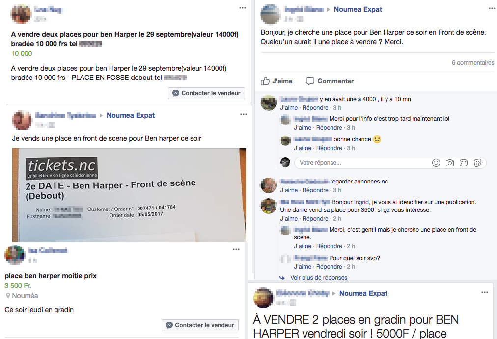 A quelques heures de la première des deux dates de l’artiste, sur le groupe Facebook (fermé) « Nouméa expat », on trouve par exemple une vingtaine d’annonces, tout comme sur les groupes « vente de tout Nouvelle-Calédonie » (groupe fermé) et une trentaine sur le groupe (public) « Vente objets divers.nc »