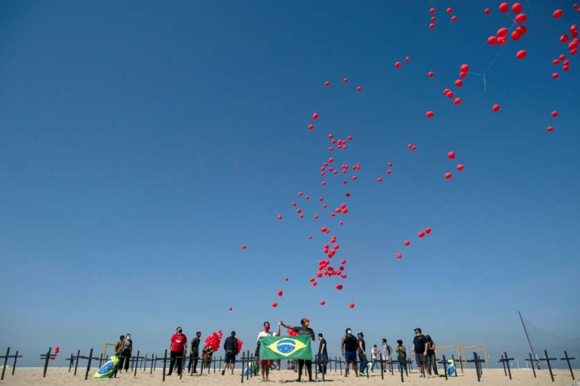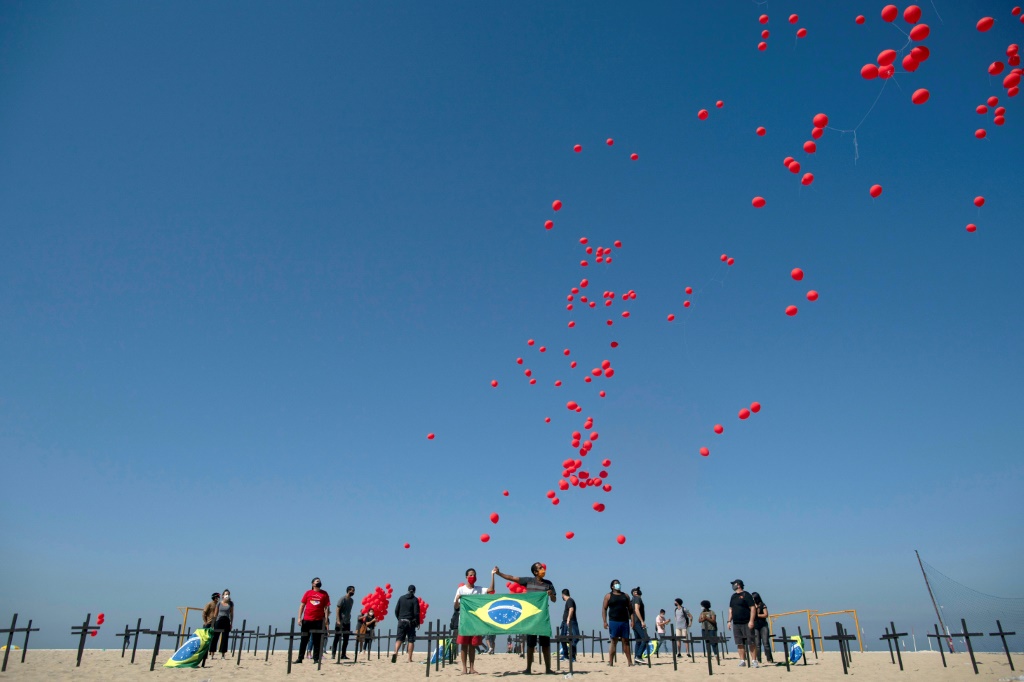 Sur la plage de Copacabana, à Rio, l'ONG Rio de Paz a organisé samedi matin un lâcher de 1.000 ballons rouges en hommage aux personnes décédées du Covid-19 au Brésil, avec 100 croix noires plantées dans le sable.