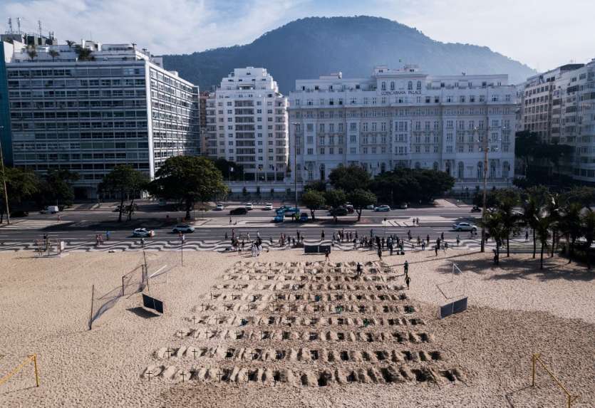 Jeudi matin, sur la célèbre plage de Copacabana, haut lieu du tourisme à Rio de Janeiro, l'ONG Rio de Paz a creusé symboliquement une centaine de tombes dans le sable pour rendre hommage aux morts du coronavirus et protester contre l'"incompétence" des pouvoirs publics.