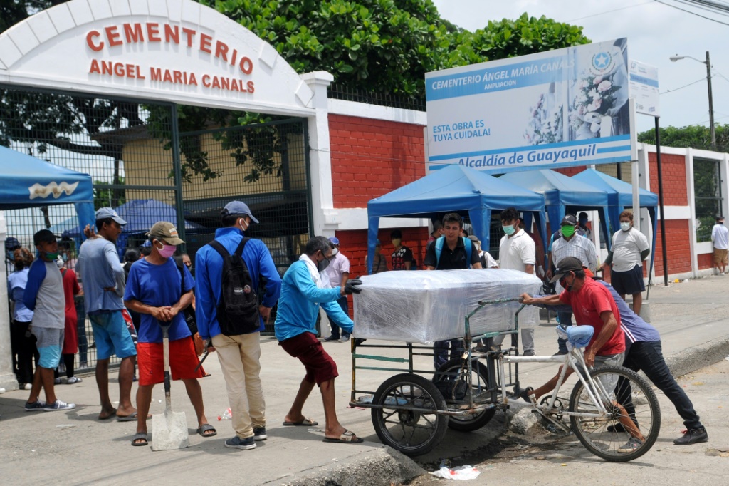 - © 2020 AFP | Crée le 10.04.2020 à 13h45 | Mis à jour le 10.04.2020 à 13h50ImprimerLe cercueil d'une victime du Covid-19 est transporté à l'entrée d'un cimetière de Guayaquil (Equateur), le 9 avril 2020 Jose SANCHEZ-AFP