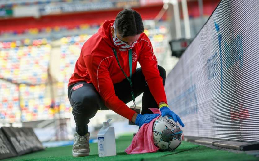 - © 2020 AFP | Crée le 18.05.2020 à 01h44 | Mis à jour le 18.05.2020 à 01h45ImprimerDésinfection du ballon pendant le match entre Fortuna Düsseldorf et SC Paderborn, le 16 mai 2020 à Düsseldorf, lors de la reprise de la Bundesliga en Allemagne SASCHA SCHUERMANN-POOL/AFP