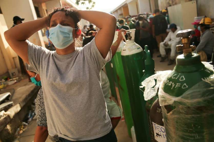 - © 2020 AFP | Crée le 21.05.2020 à 07h45 | Mis à jour le 21.05.2020 à 07h50ImprimerDes proches de malades du Covid-19 font la queue pour faire recharger des bouteilles d'oxygène à l'hôpital d'Iquitos, au Pérou, le 14 mai 2020 Cesar Von BANCELS-AFP