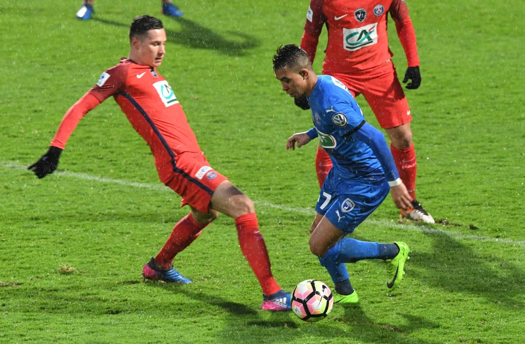 - © 2017 AFP | Crée le 02.03.2017 à 06h40 | Mis à jour le 02.03.2017 à 06h45ImprimerL'attaquant du PSG Julian Draxler (g) à la lutte avec le Niortais Zakaria Grich (d) en Coupe de France, le 1er mars 2017 à Niort MEHDI FEDOUACH-AFP