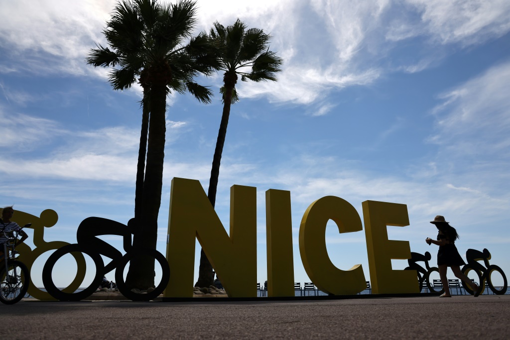 - © 2020 AFP | Crée le 28.08.2020 à 02h13 | Mis à jour le 28.08.2020 à 02h15ImprimerUne femme passe devant le logo du départ du Tour de France 2020 sur la promenade des Anglais à Nice, le 26 août Kenzo Tribouillard-AFP
