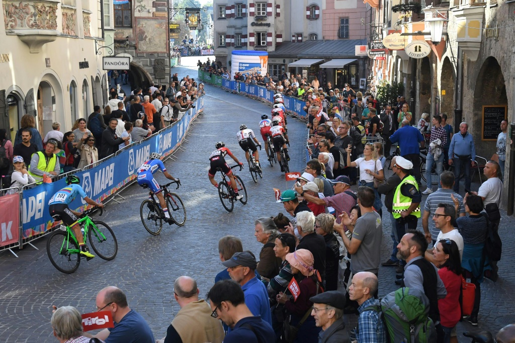 - © 2018 AFP | Crée le 30.09.2018 à 19h25 | Mis à jour le 30.09.2018 à 19h30ImprimerLes Mondiaux de cyclisme sur route se déroulent à Innsbrück, dans le Tyrol autrichien, ici la course des -23 ans, le 28 septembre 2018 Christof STACHE-AFP
