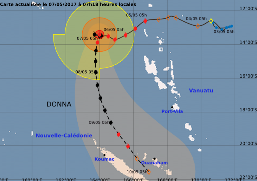 « Il sera à environ 450 km dans le nord de Bélep en fin de nuit de dimanche à lundi, puis il continue à s'approcher de la Nouvelle-Calédonie en incurvant sa trajectoire vers le sud sud-est. Donna devrait s'intensifier à nouveau aujourd'hui pour atteindre son intensité maximale dans la journée de lundi au stade de cyclone tropical intense. Sur la Nouvelle-Calédonie, le vent de secteur est à sud-est souffle entre 20 et 25 noeuds (35-45 km/h), rafales à 30/35 noeuds (55-65 km/h), localement 25 à 30 noeuds (45-55 km/h), rafales à 40 noeuds (75 km/h) sur le nord de la côte est et l'extrême Nord. Ce soir, le vent d'est se renforce partout hormis sur l'Ouest. Il atteint 25 à 30 noeuds (45-55 km/h) rafales à 40 noeuds (75 km/h), avec des pointes entre 30 et 35 noeuds (55-60 km/h) rafales à 45 noeuds (80 km/h) sur le Nord-Est et la pointe Nord de la Grande-Terre. Les averses deviennent plus nombreuses dés ce matin aux Loyauté, puis sur la façade Est et le Sud. La trajectoire de Donna le rapproche de la Nouvelle-Calédonie. Même si son intensité va commencer à faiblir avant de passer au plus près du territoire, Donna constitue un réel danger, qui doit être pris en considération et surveillé avec attention. Il est donc conseillé de rester à l'écoute des informations météorologiques qui seront diffusées dans les prochains jours. »