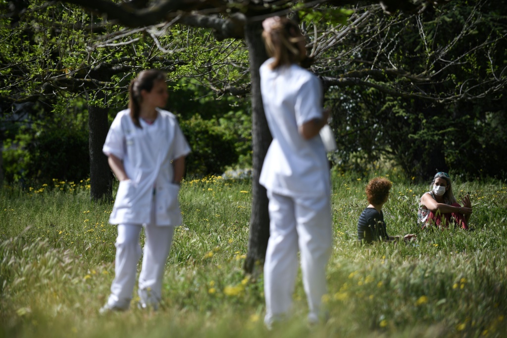 - © 2020 AFP | Crée le 22.04.2020 à 00h23 | Mis à jour le 22.04.2020 à 00h25ImprimerDes infirmières (dont une assise, avec le masque) et une patiente dans le jardin de l'hôpital psychiatrique marseillais de Valvert, le 16 avril 2020 Anne-Christine POUJOULAT-AFP