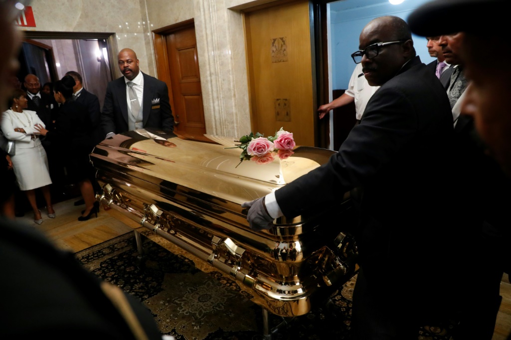 Le cercueil doré d'Aretha Franklin, sur lequel était posé un simple bouquet de roses, a quitté l'église à 18H45 (22H45 GMT), après près de huit heures d'une cérémonie religieuse marathon ayant débuté à 11 heures du matin.