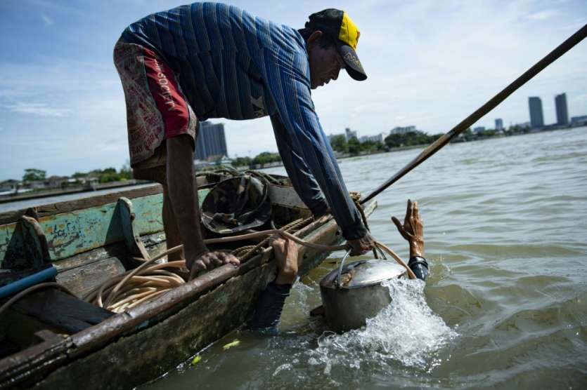 "Nous cherchons de vieilles pièces de monnaie et parfois on nous embauche pour retrouver des objets perdus dans la rivière", explique-t-il. Il plonge depuis plus de 30 ans dans ce fleuve qui est l'axe principal du commerce du royaume depuis des siècles, avec des navires chargés de biens venant de Chine notamment, remontant du Golfe de Thaïlande vers Bangkok.