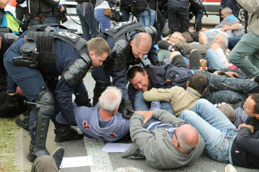 - © 2017 AFP | Crée le 05.09.2017 à 23h32 | Mis à jour le 05.09.2017 à 23h35ImprimerDes salariés de GM&S délogés par les forces de l'ordre le 5 septembre 2017 à Poissy, près de Paris JACQUES DEMARTHON-AFP
