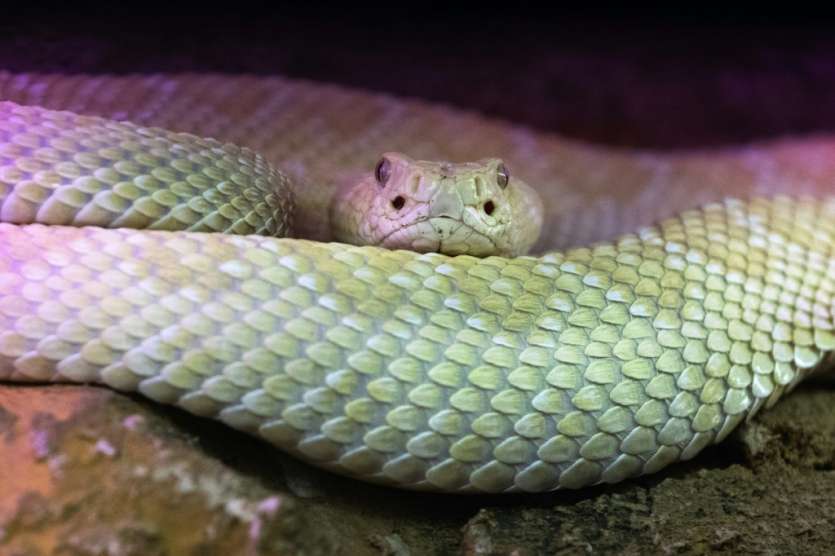 Après le magnifique cobra du Cap, au venin neurotoxique et cardiotoxique mortel pour l'homme, c'est au tour du crotale diamantin de l'ouest de rejoindre son logement parisien, en imitant le bruit d'une crécelle. Son venin provoque des hémorragies.