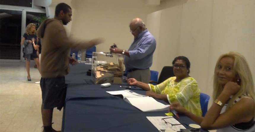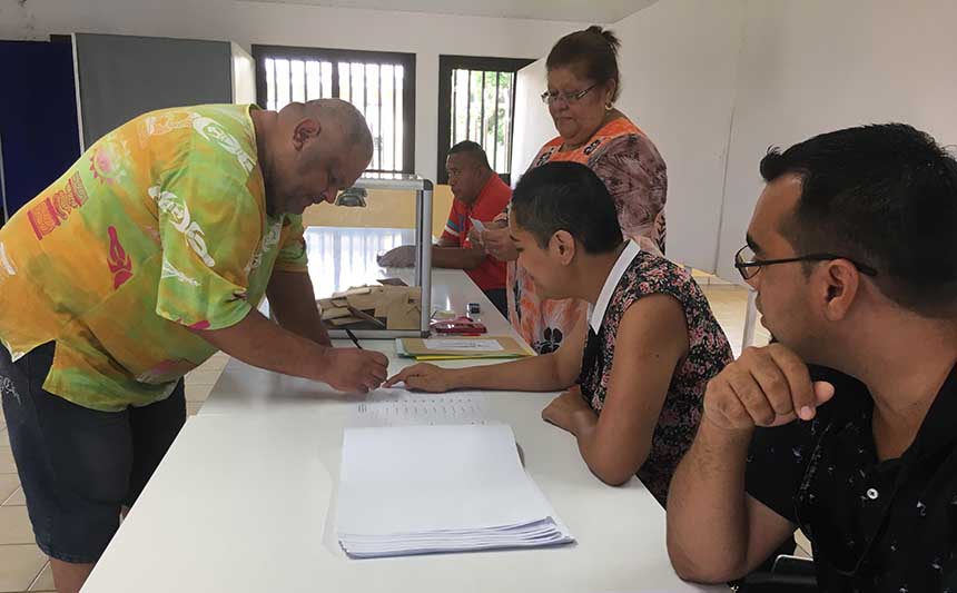 A dix minutes de la clôture du scrutin, les derniers votants du bureau de vote n°2 de Nouméa se présentent encore.