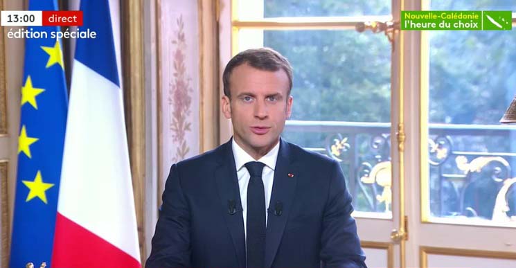 « Ce jour était le rendez-vous que les Calédoniens et l'Etat s'étaient donnés à eux-mêmes pour surmonter les divisions » […] Les électeurs ont pu choisir souverainement, en connaissance de cause, la relation entre la Nouvelle-Calédonie et la France […] Ils se sont exprimés aujourd'hui, majoritairement, pour que la Nouvelle-Calédonie reste française. […] C'est pour nous une marque de confiance dans la République française, dans son avenir, dans ses valeurs. […] Le seul vainqueur, c'est le processus en faveur de la paix qui porte la Nouvelle-Calédonie depuis trente ans, l'esprit de dialogue que personne n'entamera. […] Je mesure la déception de ceux qu'anime la volonté de l'indépendance [et] je veux dire que l'Etat est engagé auprès de la Nouvelle-Calédonie pour garantir la dignité de toutes les composantes de la société autour des valeurs d'égalite, de liberté et de fraternité. […] Nous pouvons les partager, au delà de nos divergences, dans l'humilité et dans le respect. » « J'invite chacun à se tourner vers l'avenir et à construire une Calédonie forte de son histoire et tournée vers demain », a ajouté le chef de l'État. Avant de rappeler l'arrivée ce lundi 5 novembre du Premier ministre Edouard Philippe et d'Annick Girardin, ministre des Outre-mer.
