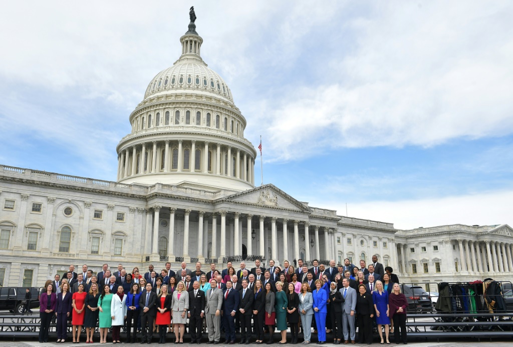 - © 2019 AFP | Crée le 03.01.2019 à 17h53 | Mis à jour le 03.01.2019 à 17h55ImprimerLes nouveaux élus du 116e Congrès américain posent pour une photo lors de leur première visite au Capitole, le 14 novembre 2018 MANDEL NGAN-AFP/Archives