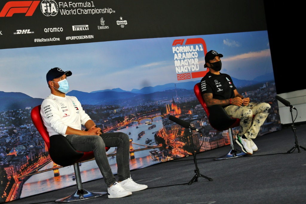 - © 2020 AFP | Crée le 17.07.2020 à 04h13 | Mis à jour le 17.07.2020 à 04h15ImprimerLes pilotes Mercedes Valtteri Bottas et Lewis Hamilton lors d'un point presse au Hungaroring, le 16 juillet 2020, veille des essais du GP de Hongrie --POOL/AFP