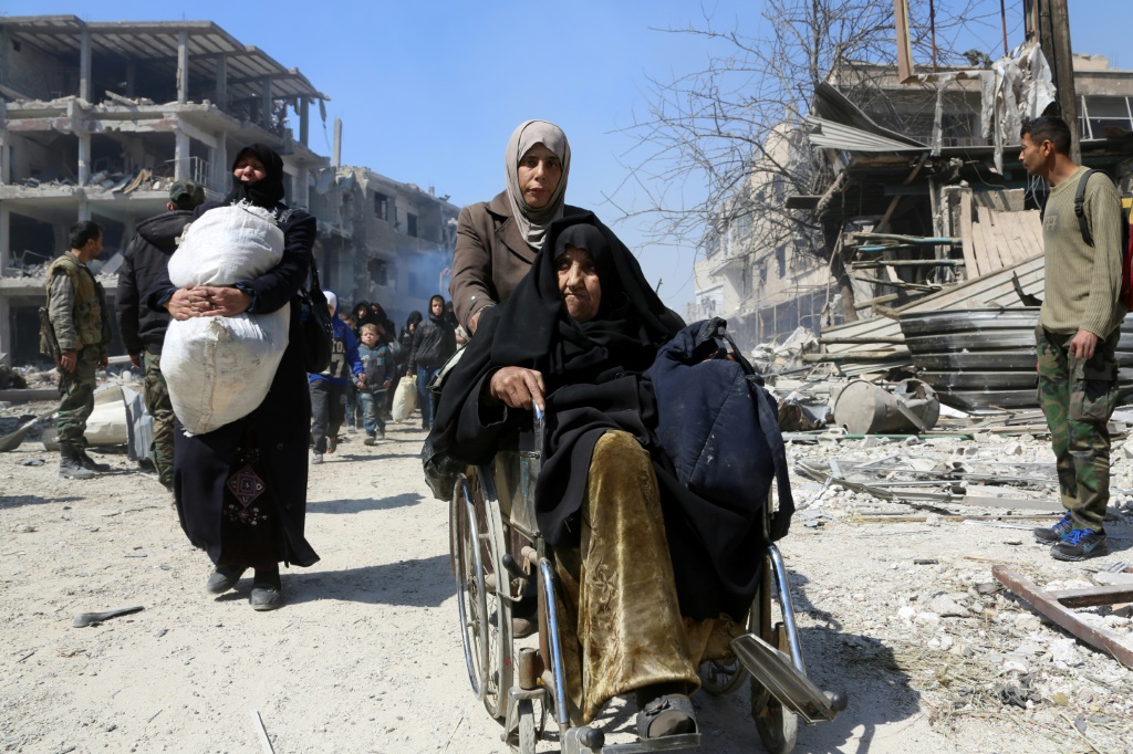 - © 2018 AFP | Crée le 18.03.2018 à 14h39 | Mis à jour le 18.03.2018 à 14h40ImprimerUne syrienne en fauteil roulant évacue la localité de Jisrine dans la Ghouta orientale, en direction de zones sous contrôle gouvernemental, le 17 mars 2018 STRINGER-AFP