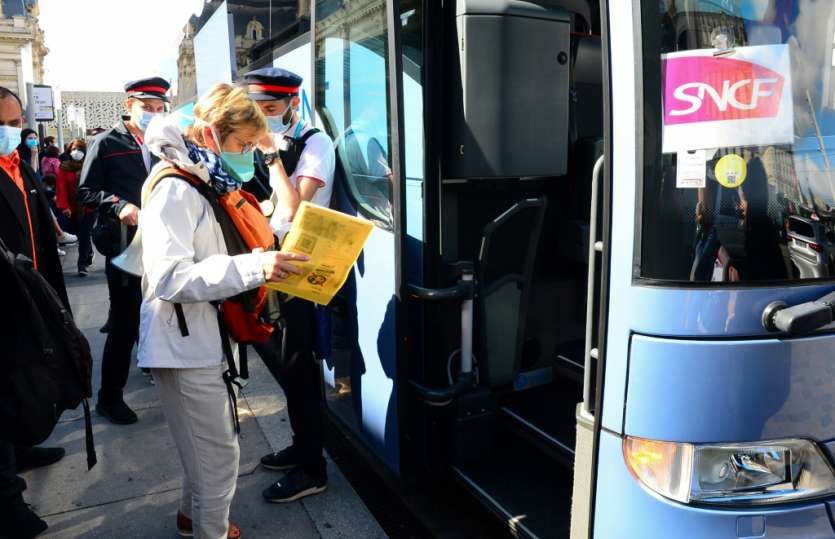 - © 2020 AFP | Crée le 01.09.2020 à 00h54 | Mis à jour le 01.09.2020 à 00h55ImprimerDes passagers bloqués dans le train Hendaye-Paris sont acheminés à Bordeaux par bus vers leurs destinations respectives le 31 août 2020 MEHDI FEDOUACH-AFP